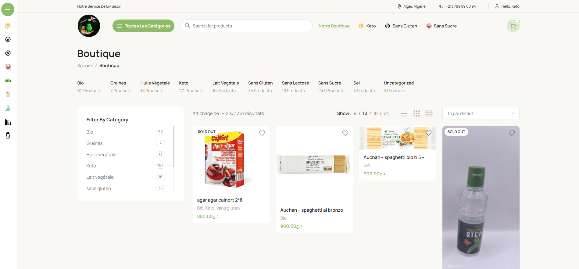 C'est une boutique en ligne pour la vente des produits avec une très grande variété (Keto, Sans sucre, Bio, Sans gluten etc). Les client peuvent passer commande directement sur le site avec possibilié de paiement à la livraison.
